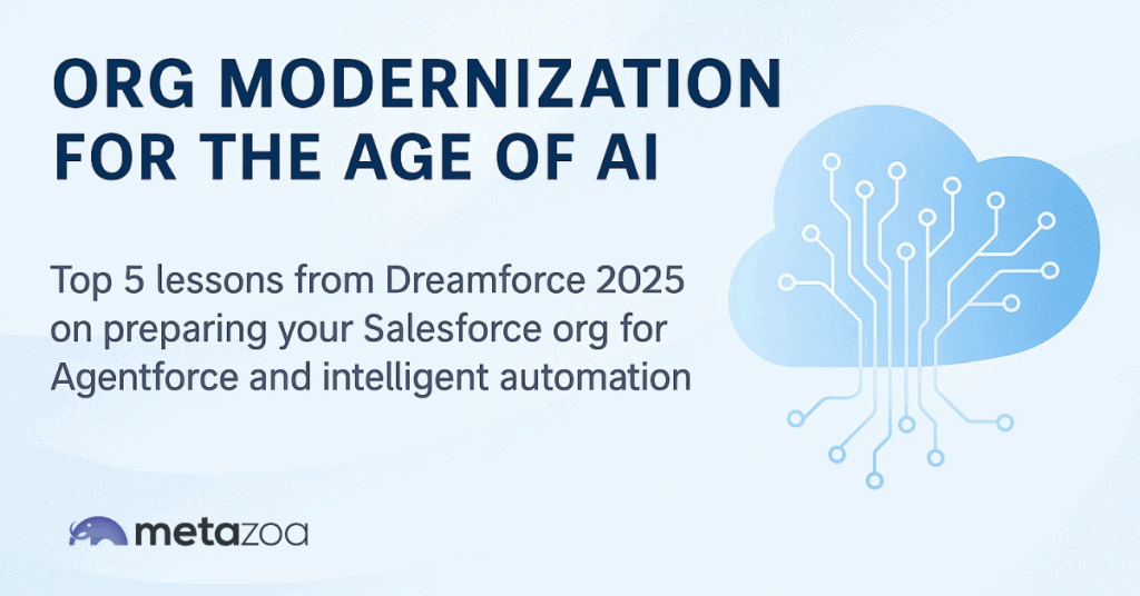 Dreamforce 2025 marked the dawn of the Agentic Enterprise, where AI agents act across data, workflows, and customer touchpoints. The conference underscored one critical message: AI success starts with clean, well-governed Salesforce orgs. Discover the top five lessons from Dreamforce 2025 and learn how Metazoa Snapshot helps companies modernize their orgs, strengthen governance, and prepare for the age of intelligent automation.