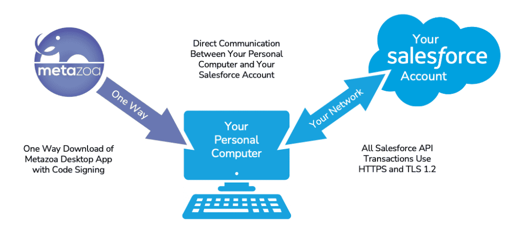 The code signed Metazoa Player is downloaded once from the file server at www.metazoa.net. The Player can also be delivered by mail on CD-ROM if desired. The Metazoa Player uses TLS 1.2 and HTTPS for network communication with the Data, Metadata, and Tooling APIs. This is the same network protocol that the Salesforce HTML web application uses to run in a browser, except Metazoa is communicating with XML instead of HTML documents. The diagram below illustrates this architecture.
